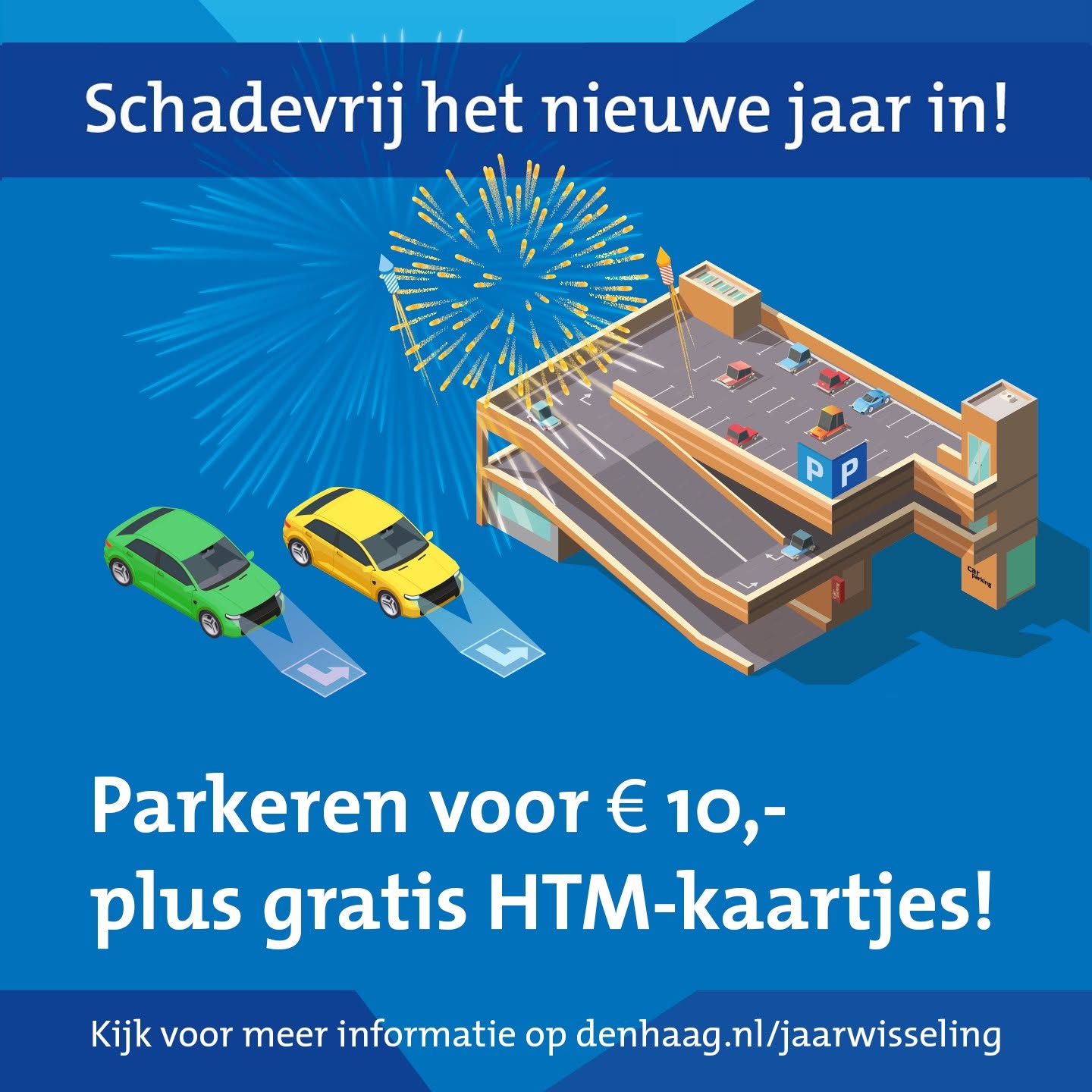 Schadevrij het nieuwe jaar in? Tijdens de jaarwisseling kun je veilig en met korting parkeren in een parkeergarage. Parkeren kost bij 4 parkeergarages tijdens de jaarwisseling โฌ 10,-. Je krijgt twee gratis HTM-kaartjes voor het openbaar vervoer van en naar de garage.